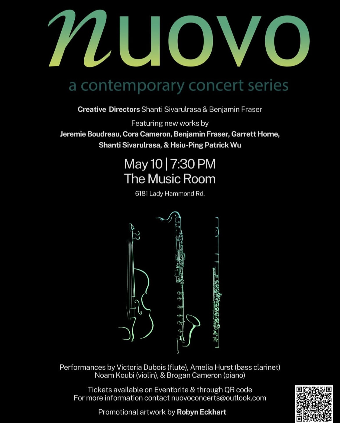 A concert of new works by Boudreau, Cameron, Fraser, Horne, Sivalrusa, and Wu. Performances by Victoria Dubois (flute), Amelia Hurst (bass clarinet), Noam Koubi (violin), and Brogan Cameron (piano). Tickets available on Eventbrite: https://www.eventbrite.ca/e/nuovo-a-contemporary-concert-series-spring-2025-concert-tickets-1254900855239